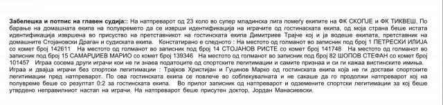 „На натпреварот од 23 коло во супер младинска лига помеѓу екипите на ФК СКОПЈЕ и ФК ТИКВЕШ, По барање на домашната екипа на полувремето да се изврши идентификација на играчите од гостинската екипа, од моја страна беше истата идентификација извршена во присуство на претставникот на гостинската екипа Димитриев Трајче кој и ја водеше екипата, претставник на домашните Стојановски Драган и судиската екипа.