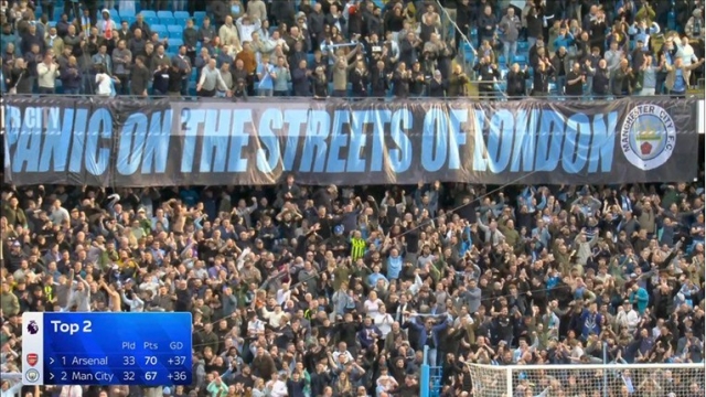 Навивачите на Манчестер Сити имаа подготвено порака во случај да победат. По завршувањето на мечот, поставија транспарент на кој пишуваше „Паника на улиците на Лондон“. Репликата е од песната „Panic“ од 1986 година, изведена од групата „Смитс“. Паниката е реалност за секој што го сака Арсенал бидејќи предноста од девет бода што „топчиите“ ја имаа над Сити пред десет дена се стопи и сега Сити се прашува во борбата за титулата.