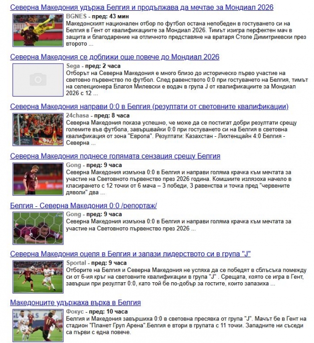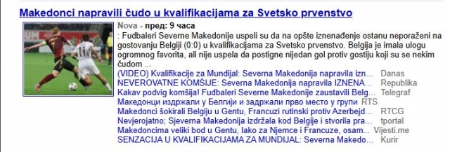 „Македонците изненадувачки останаа непоразени на гостувањето кај Белгија (0:0) во квалификациите за Светското првенство. Белгијците беа голем фаворит, но не успеаја да постигнат ниту еден гол против гостите кои чудесно се одбранија. Домаќинот имаше многу силен состав, со Кевин Де Брујн, Жереми Доку, Лоис Опенда, Леандро Тросард, но тоа не им помогна да победат во овој натпревар. Македонија, благодарение на овој бод, остана на првата позиција во квалификациската група Ј со 12 бода, еден повеќе од Белгија и два повеќе од Велс“, пишува еден од српските медиуми.