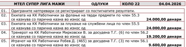 Тимот со најмногу шампионски титули (15) поради ова е казнет со 48.000 денари (по 24.000 за двата прекршока), како и дополнителни 28.800 денари за техничките грешки на тренерот Владимир Мирковски (19.200) и на Дамјан Робев (9.600). На КФМ е сега да продолжи со овој курс со цел да се искрени оваа стара навика со плукање во салата во скопскиот Градски парк, нешто на што реагираа сите судии и кошаркари кои гостувале во овој објект во изминативе 70 години.