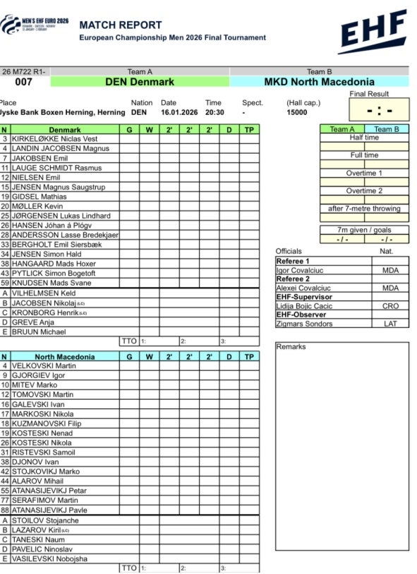 Натпреварот меѓу Македонија и Данска се игра вечерва од 20.30 часот.