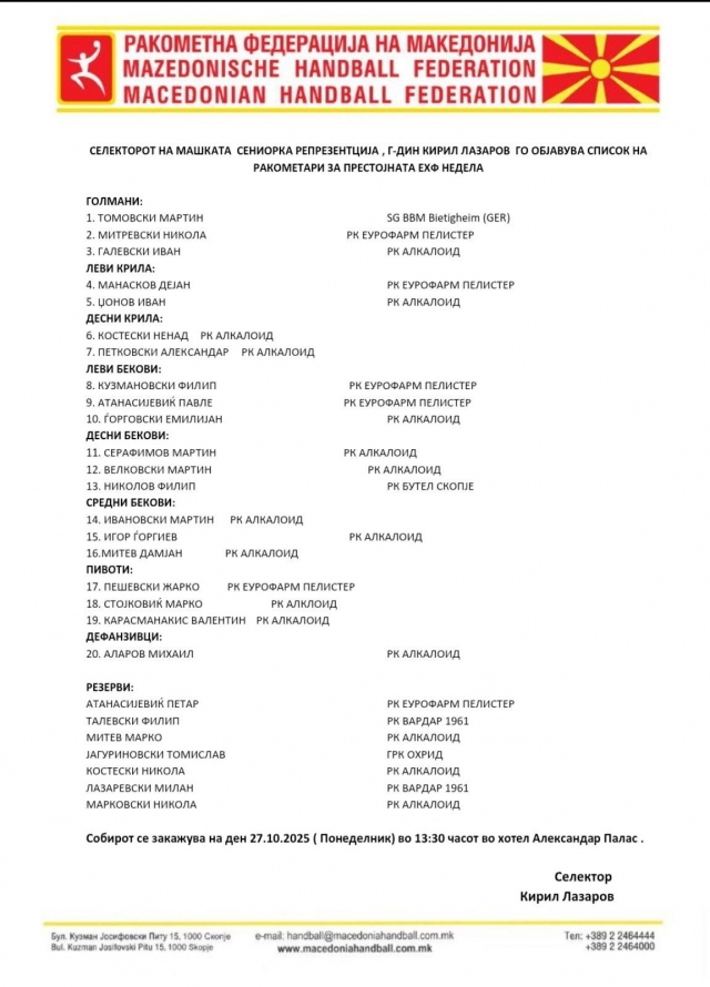 На списокот на Лазаров има 20 ракометари плус уште седум како резерва.